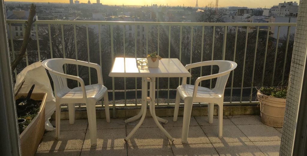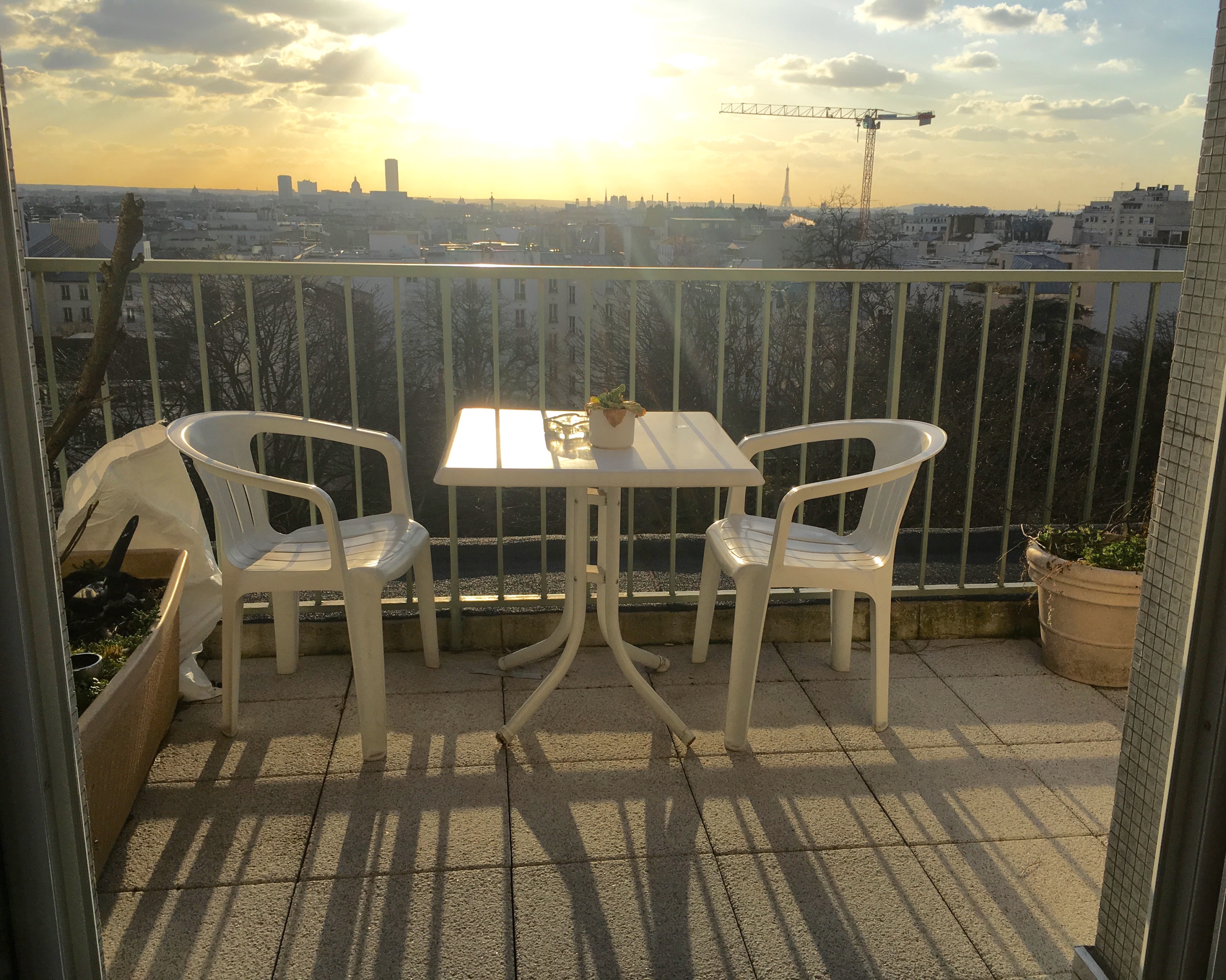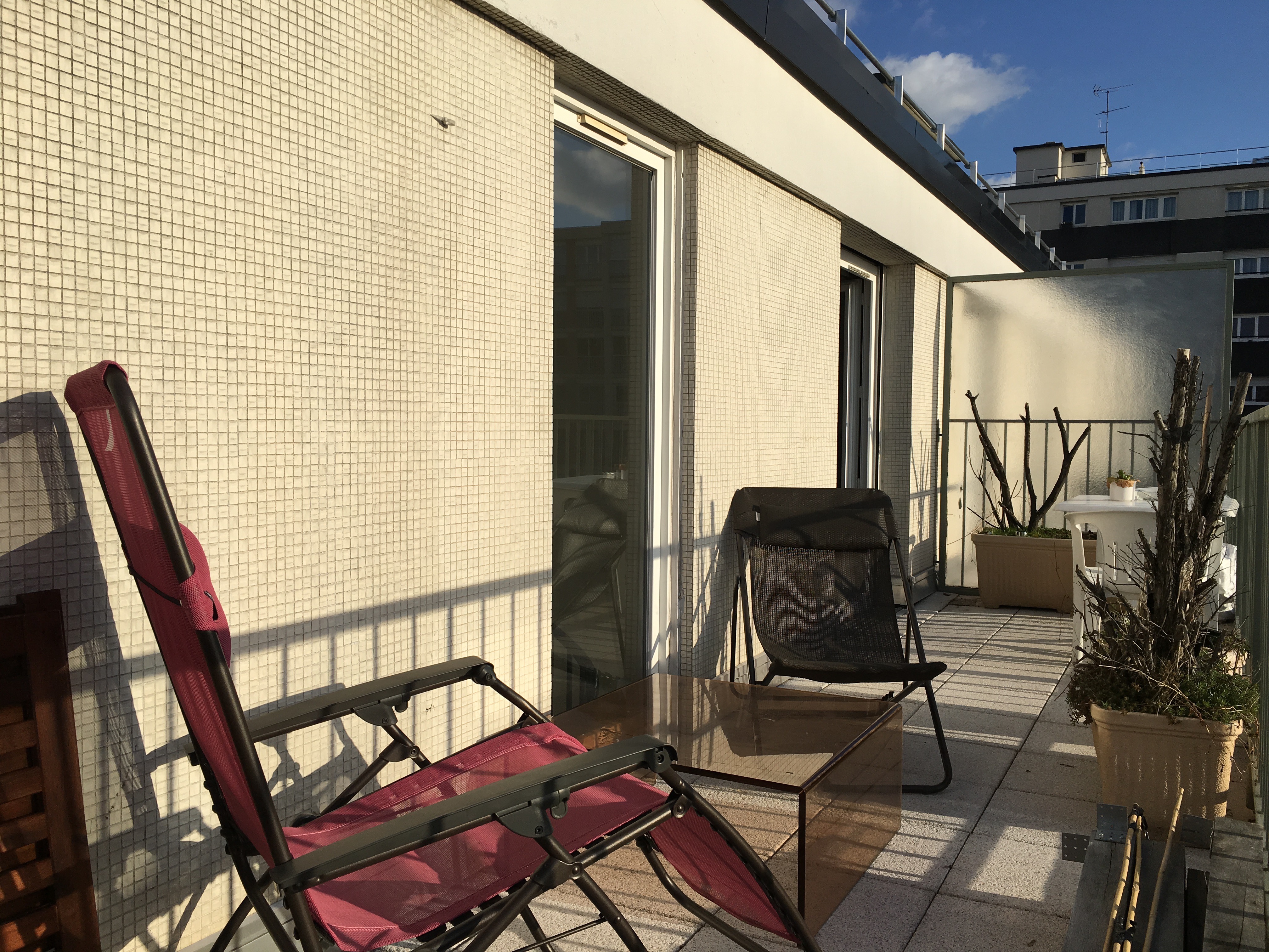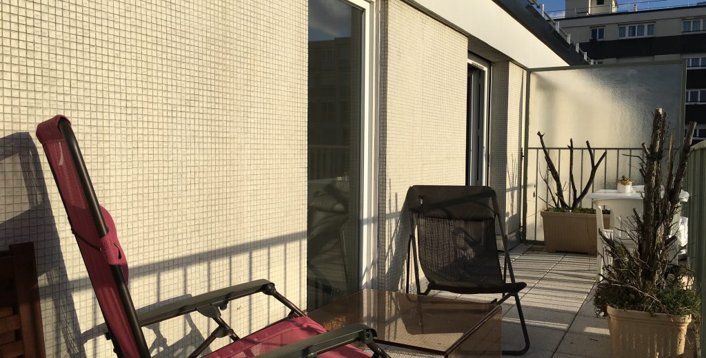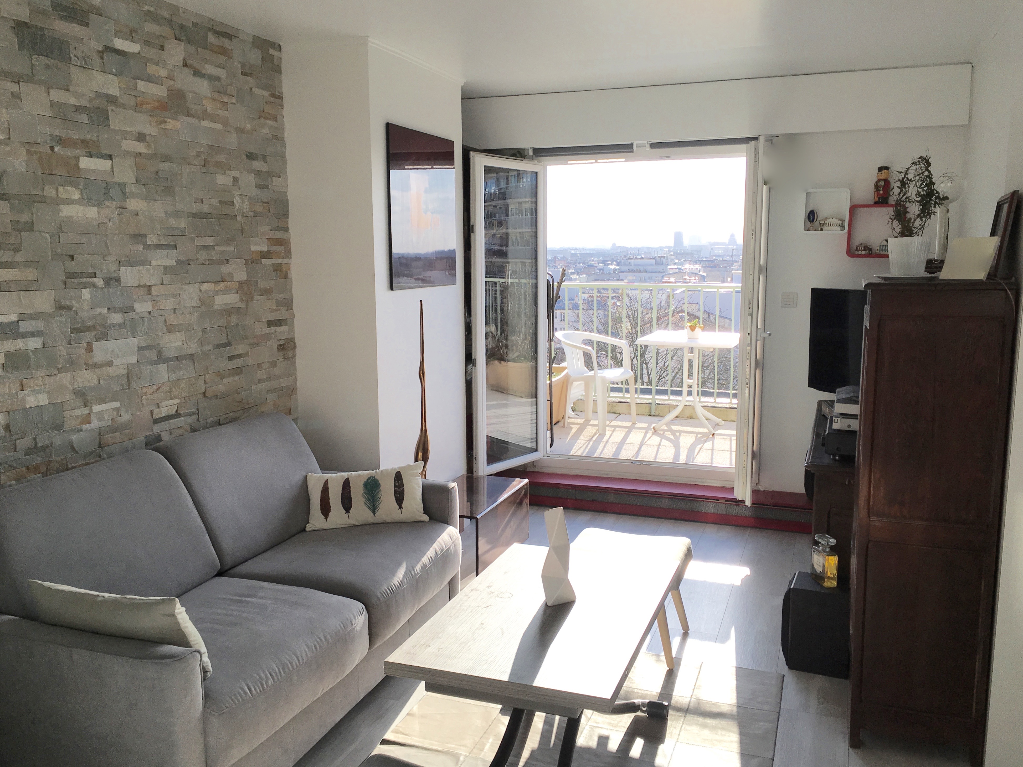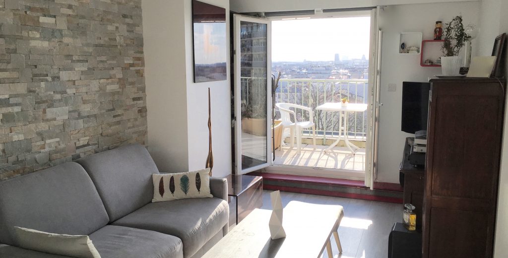 Paris 11, Charonne, superbe appartement traversant avec terrasse exposée plein SUD, avec une vue sur tous les plus beaux monuments de Paris dont la Tour Eiffel!! avec entrée, séjour avec terrasse de 12 m2, cuisine US, coin chambre avec balcon, salle d’eau et wc. Très calme. 4 fenêtres! Cave et Parking. Bel immeuble année 1974 en parfait état. Beau produit.