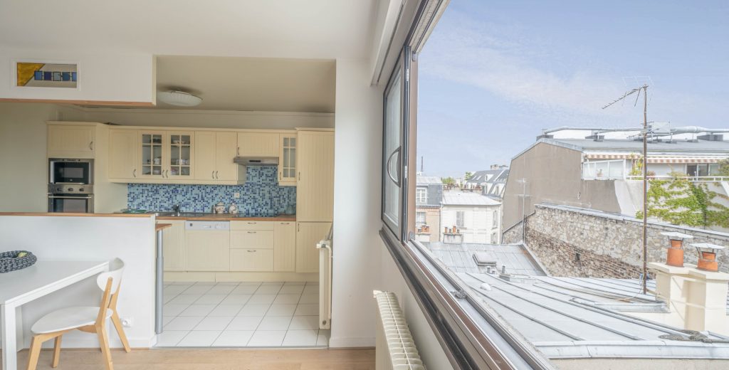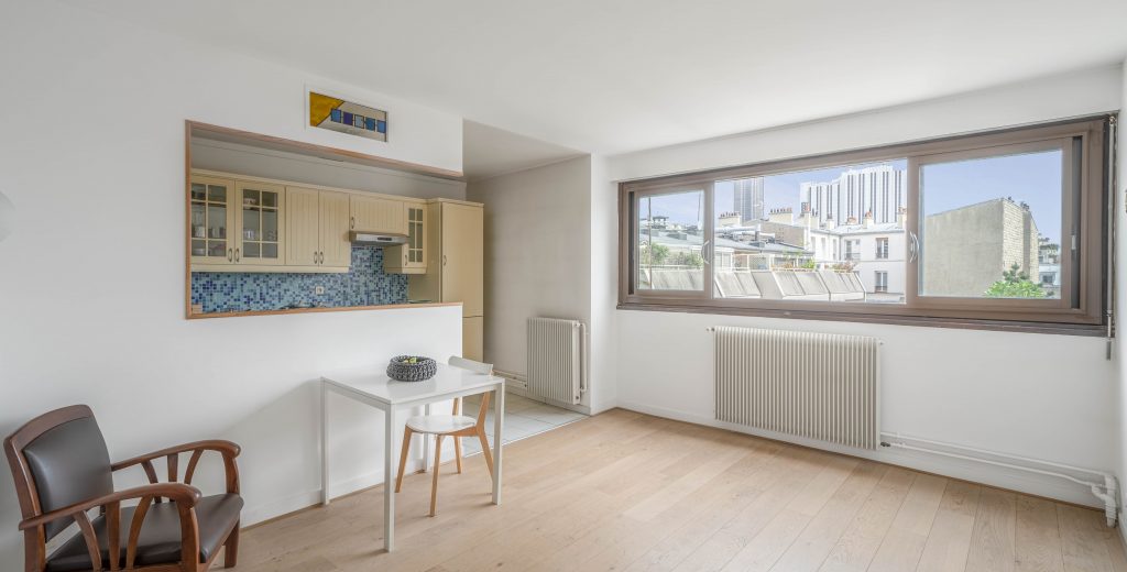 6ÈME ET DERNIER ÉTAGE AVEC ASCENSEUR AVEC VUE : Appartement 2P pièces de 53 m2, avec une grande pièce de vie de 30 m2 environ, cuisine américaine, une chambre, salle d’eau, et un WC indépendant.