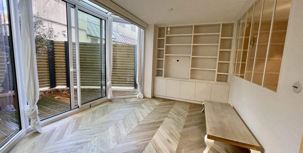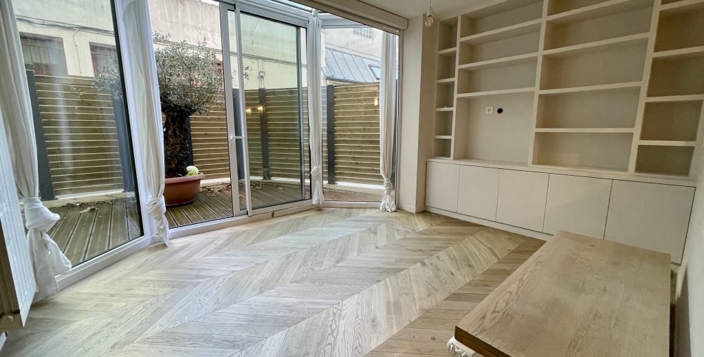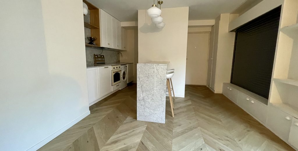 Un appartement 2 pièces récemment rénové par un architecte d’intérieur avec des matériaux de qualités. Il se situe au rez-de-chaussée d’un immeuble récent et bien entretenu, et se compose comme suit : une entrée avec placards, un séjour donnant sur une grande terrasse, cuisine moderne et équipée ouverte sur le séjour, une chambre avec dressing, une salle d’eau, un WC indépendant. Une cave. Possibilité de parking en sus du prix.