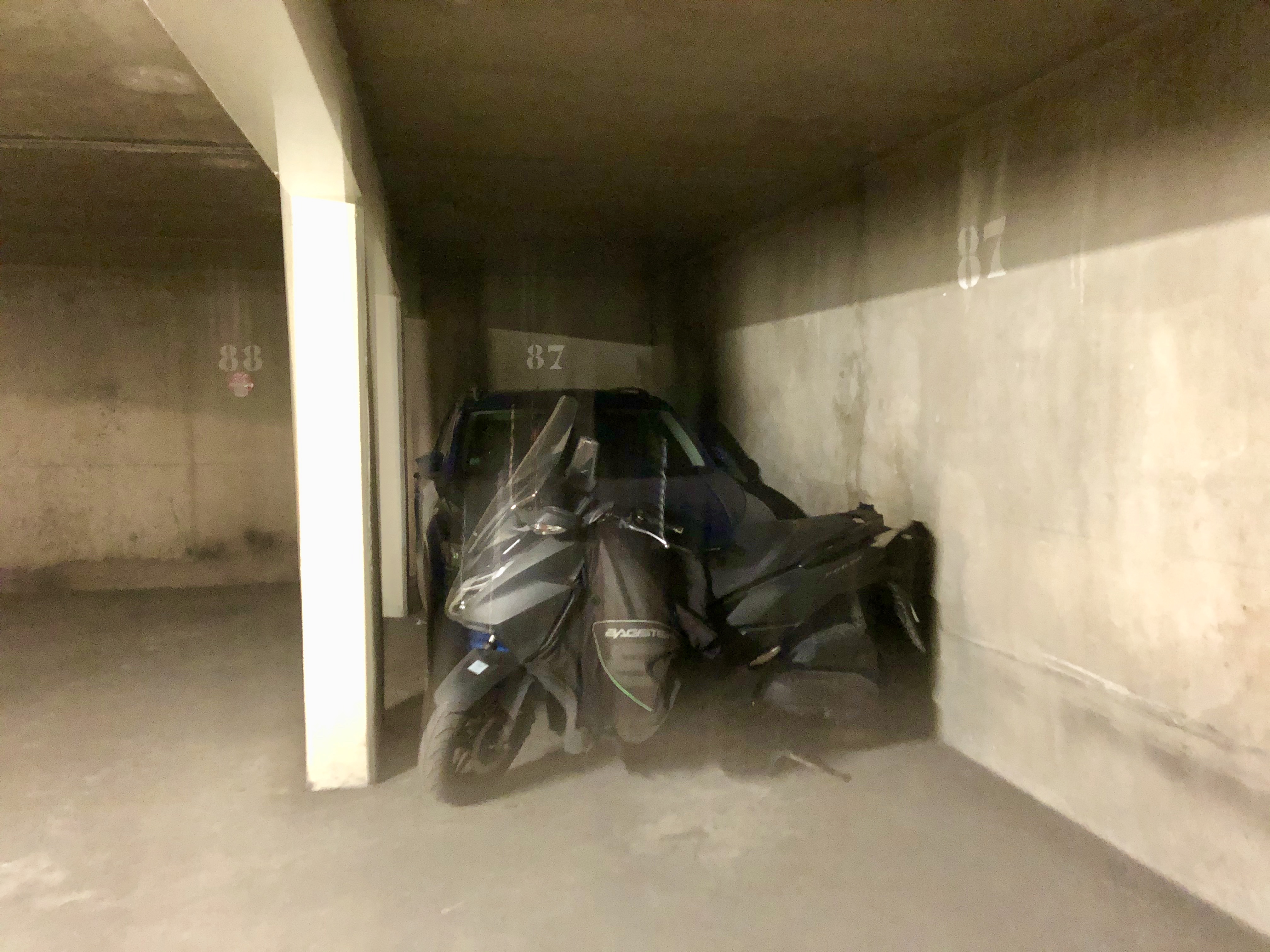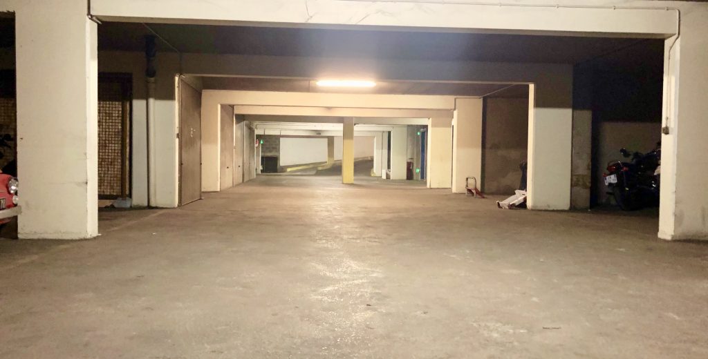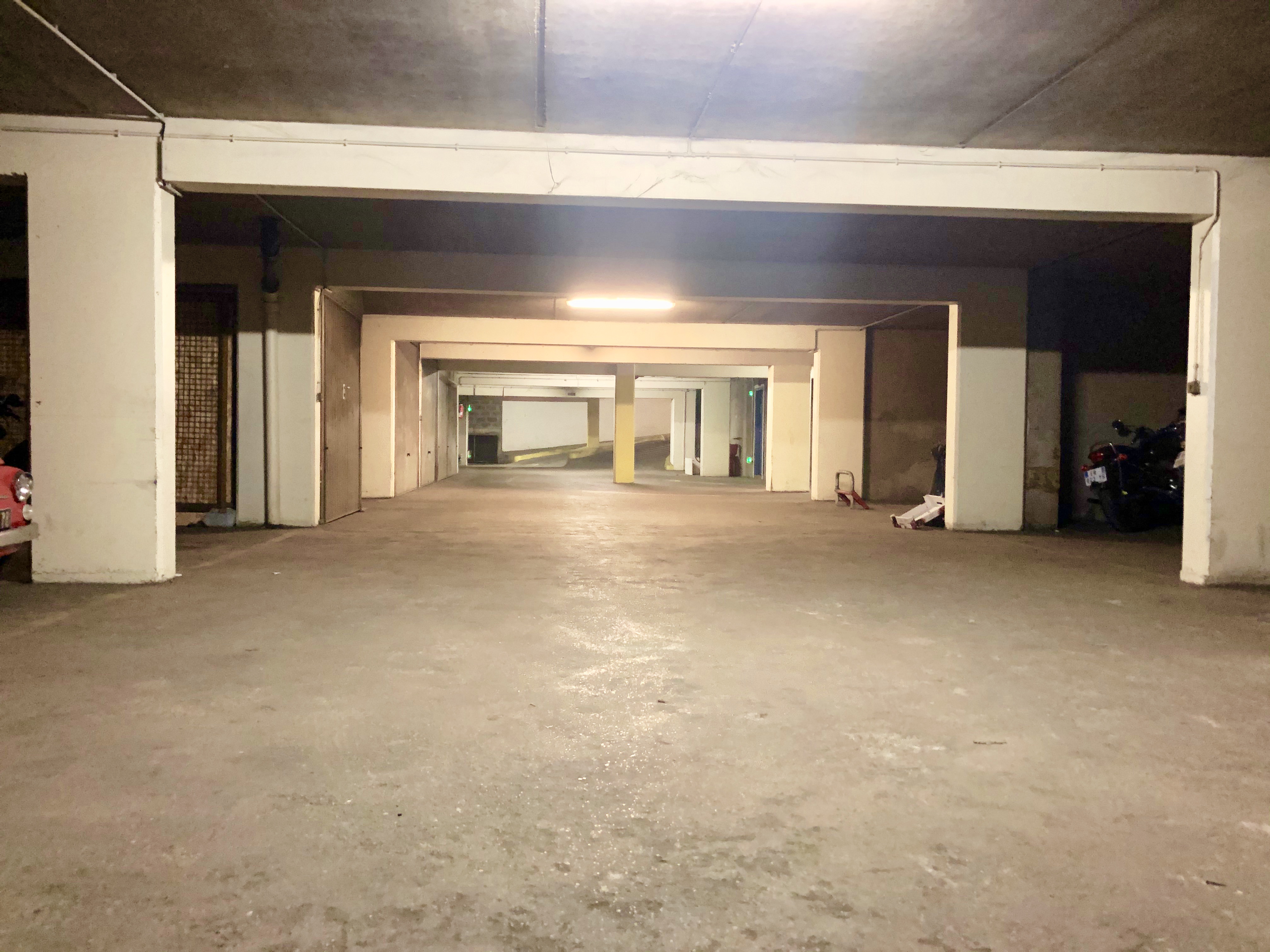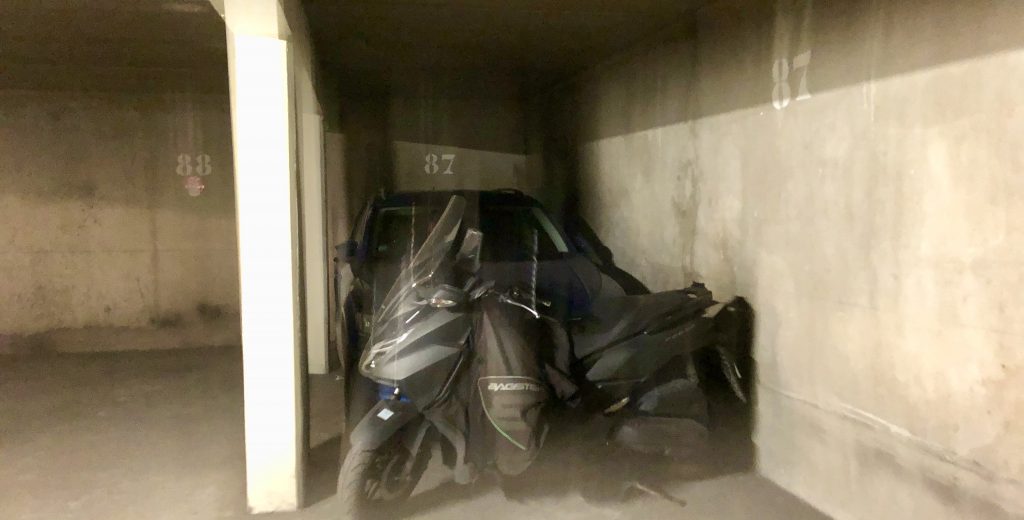 Emplacement de parking au 1er sous-sol d’un immeuble des années 1980 sécurisé.